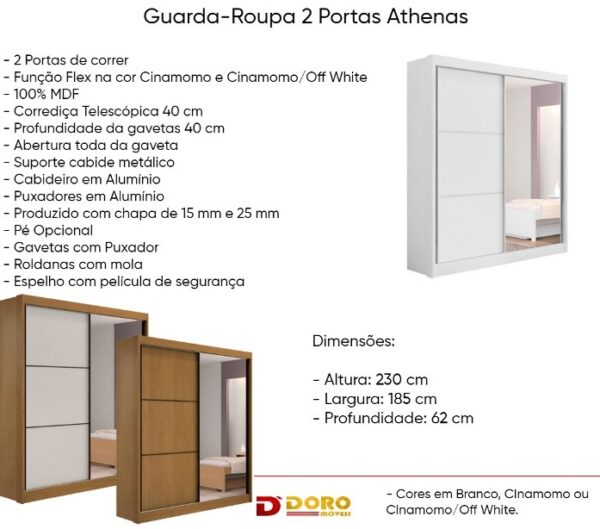 Guarda Roupas Atenas 2 Portas Correr Com Espelho 100% Mdf D’doro