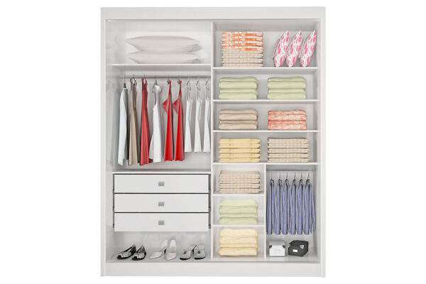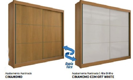 Material | 100% MDF, 2 Portas de correr, Cabideiro em alumínio, Corrediça Telescópica 40 cm, Função Flex na cor Cinamomo e Cinamomo/Off White, Gavetas com Puxador, Produzido com chapa de 15 mm e 25 mm, puxadores em alumínio, Roldanas com mola, Suporte cabide metálico |