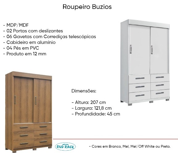 | Material | 02 Portas com deslizantes, Cabideiro em alumínio, Corrediças telescópicas nas gavetas, Estrutura MDP/MDF, pes em pvc, Produto em 12 mm |